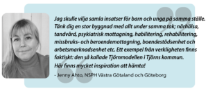 Det tredje handlar om att samla insatser för barn och unga på samma ställe. Tänk dig en stor byggnad där du har allt under samma tak; vårdcentral/närhälsa med BVC och MVC, tandläkare, psykiatrisk mottagning för vuxna och barn, habilitering, rehabilitering med fysioterapeuter, missbruks- och beroendemottagning inklusive provtagning, boendestödsenhet och arbetsmarknadsenhet. Här ska det även finnas en filial från Försäkringskassan och Arbetsförmedlingen. Ett exempel från verkligheten finns faktiskt. Det är Tjörns kommun, där man arbetar utifrån den så kallade Tjörnmodellen. Här finns mycket inspiration att hämta!